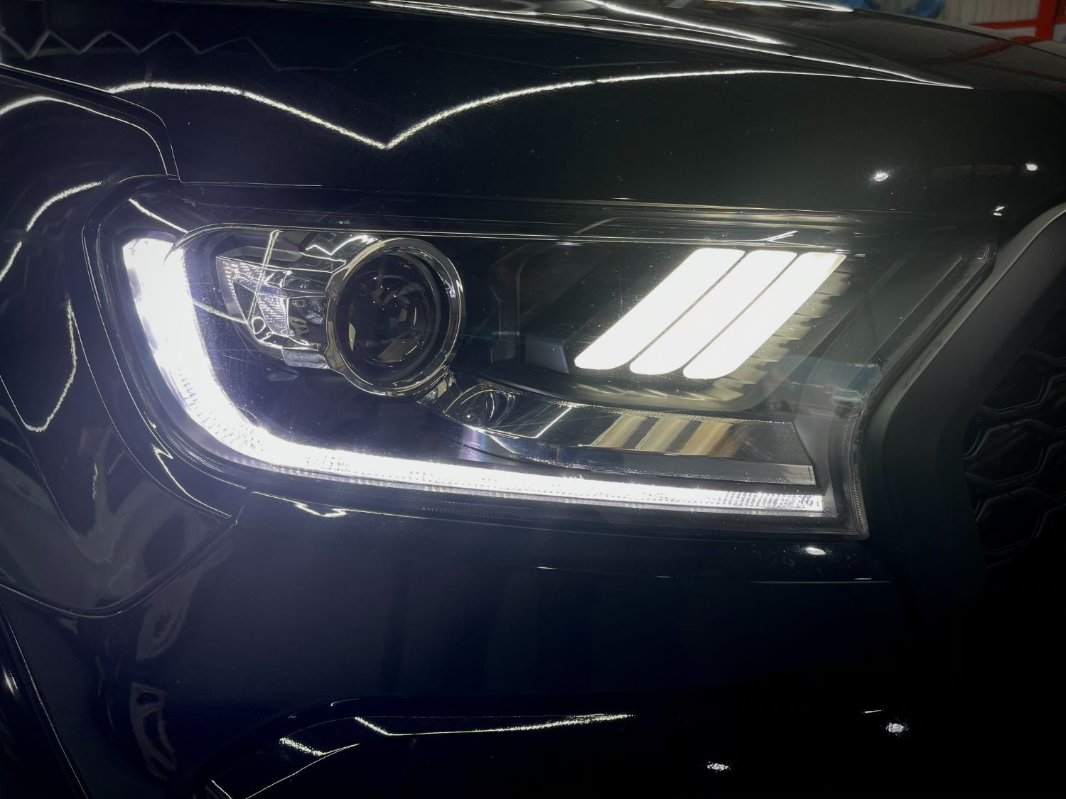 This Ranger has had a huge list of custom styling work, including Mustang style headlights, 20" wheels with chunky tyres, and complete blackout pack all around, and colour coded extended arch kit to match the factory metallic black paintwork,